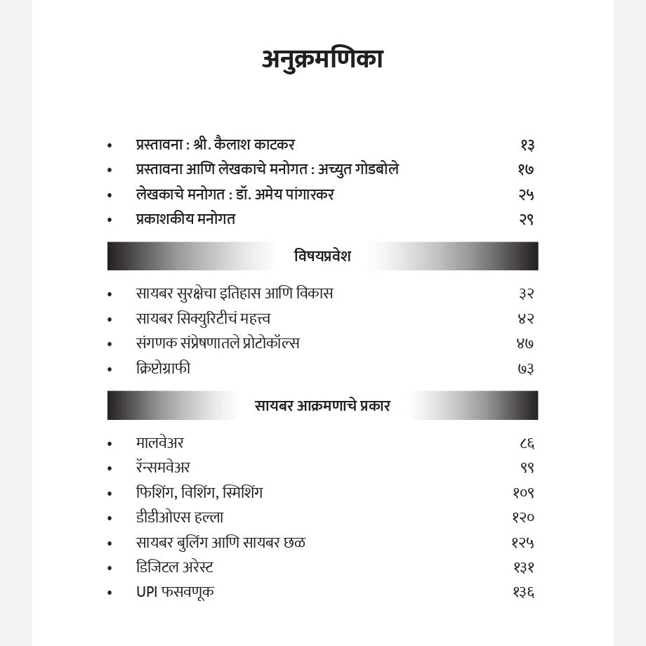 'सायबर सिक्युरिटी' म्हणजे फक्त संगणक प्रोग्रामर किंवा आयटी क्षेत्रात काम करणाऱ्यांचं काम नाही. ती प्रत्येकाची जबाबदारी आहे. कारण डिजिटल जग हे आपल्या आयुष्याचा अविभाज्य भाग बनलं आहे. या पुस्तकात आपण सायबर सिक्युरिटीचा इतिहास, सायबर सिक्युरिटीशी निगडित महत्त्वाच्या संज्ञा, आजच्या डिजिटल युगात सायबर सिक्युरिटीचं महत्त्व, आपला डेटा सुरक्षित ठेवण्यासाठीचे उपाय आणि भविष्यातली जागरूकता याबद्दल सोप्या भाषेत समजून घेणार आहोत. त्याबरोबरच तुम्हांला सायबर हल्ल्यांचे विविध प्रकार समजतील. फिशिंग, हॅकिंग, ओळख चोरी, डिजिटल अरेस्ट, UPI आणि ई-कॉमर्स फसवणूक, डीपफेक, जॉब स्कॅम्स आणि अजून बरंच काही ! प्रत्येक प्रकरण सोप्या उदाहरणांसह लिहिल्यामुळे वाचक फक्त माहितीच मिळवणार नाहीत, तर ते आपल्या दैनंदिन जीवनात प्रत्यक्ष वापरू शकतील असे उपाय घेऊन जातील.