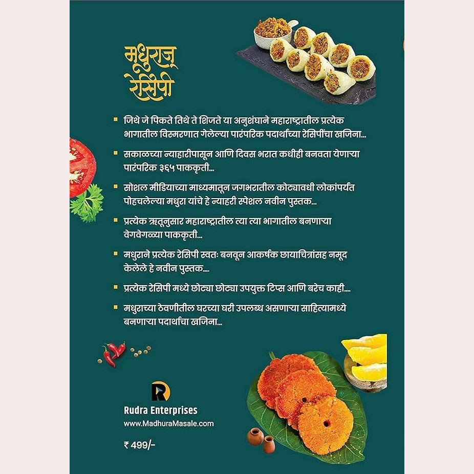 ३६५ पारंपरिक न्याहरीचे पदार्थ पृष्ठसंख्या - ३८९ ,रंगीत रेसिपी फोटो कोलाज - ८० ,एकत्रित पृष्ठसंख्या - ४८९, जिथे जे पिकते तिथे ते शिजते या अनुशंघाने महाराष्ट्रातील प्रत्येक भागातील विस्मरणात गेलेल्या पारंपरिक पदार्थांच्या रेसिपींचा खजिना… सकाळच्या न्याहारीपासून आणि दिवस भरात कधीही बनविता येणाऱ्या पारंपरिक ३६५ पाककृती… सोशल मीडियाच्या माध्यमातून जगभरातील कोट्यवधी लोकांपर्यंत पोहचलेल्या मधुरा यांचे हे न्याहरी स्पेशल नवीन पुस्तक… प्रत्येक ऋतूनुसार महाराष्ट्रातील त्या त्या भागातील बनणाऱ्या वेगवेगळ्या पाककृती… मधुराने प्रत्येक रेसिपी स्वतः बनवून फोटोज सहित नमूद केलेले हे नवीन पुस्तक.... प्रत्येक रेसिपी मध्ये छोट्या छोट्या उपयुक्त टिप्स आणि बरेच काही.... मधुराच्या ठेवणीतील घरच्या घरी उपलब्ध असणाऱ्या साहित्यामध्ये बनणाऱ्या पदार्थाचा खजिना...
