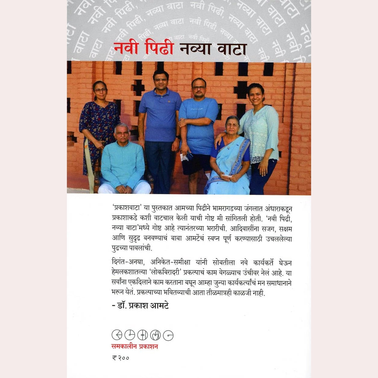 'प्रकाशवाटा' या पुस्तकात आमच्या पिढीने भामरागडच्या जंगलात अंधाराकडून प्रकाशाकडे कशी वाटचाल केली याची गोष्ट मी सांगितली होती. 'नवी पिढी, नव्या वाटा'मध्ये गोष्ट आहे त्यानंतरच्या भरारीची. आदिवासींना सजग, सक्षम आणि सुदृढ बनवण्याचं बाबा आमटेंचं स्वप्न पूर्ण करण्यासाठी उचललेल्या पुढच्या पावलांची. दिगंत-अनघा, अनिकेत - समीक्षा यांनी सोबतीला नवे कार्यकर्ते घेऊन हेमलकशातल्या 'लोकबिरादरी' प्रकल्पाचं काम वेगळ्याच उंचीवर नेलं आहे. या सर्वांना एकदिलाने काम करताना बघून आम्हा जुन्या कार्यकर्त्यांचं मन समाधानाने भरून येतं. प्रकल्पाच्या भवितव्याची आता तीळमात्रही काळजी नाही. - डॉ. प्रकाश आमटे