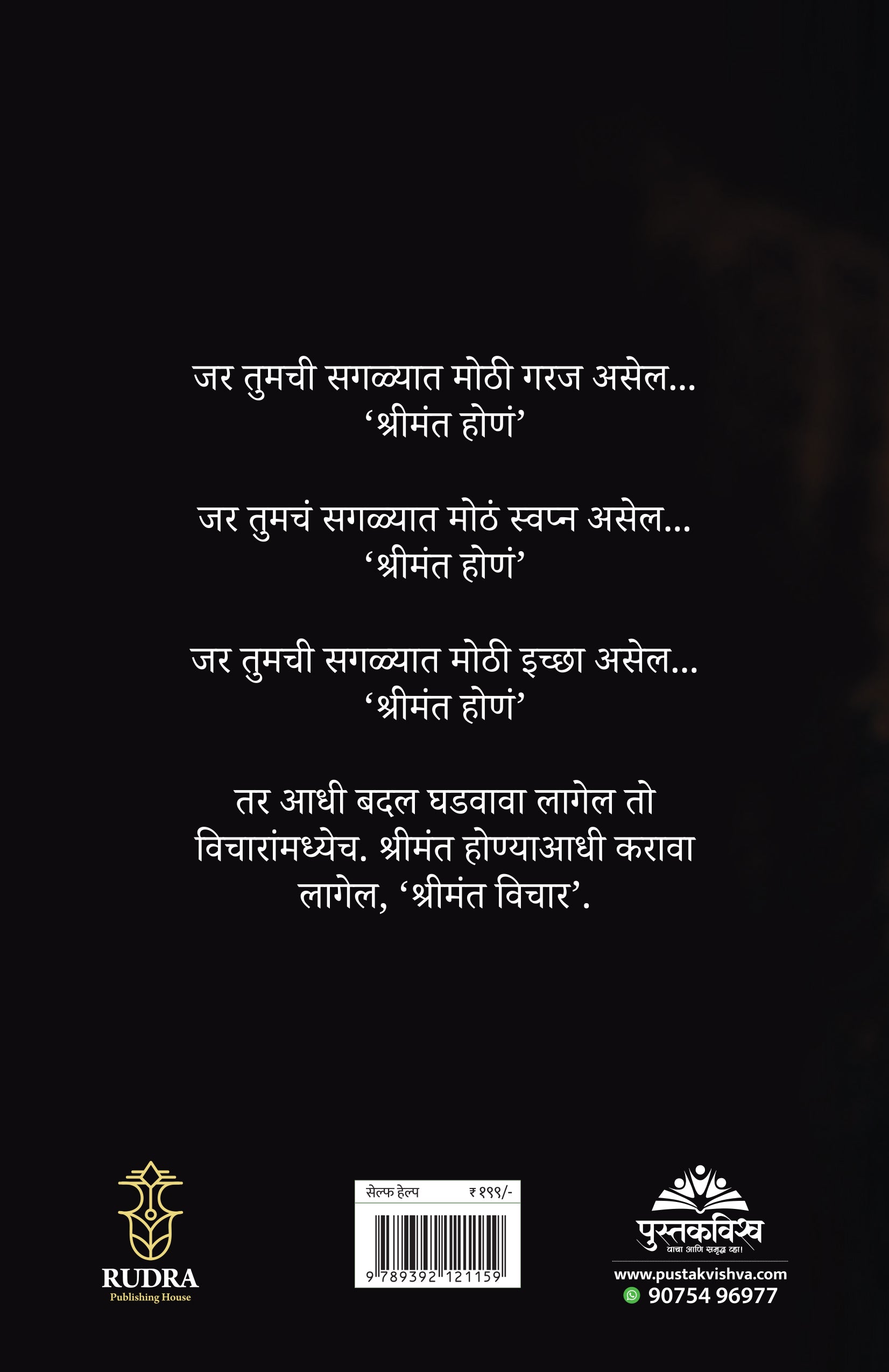 विचारांमध्ये खूप ताकद असते. ते अमूर्त नसतात, तर सामर्थ्यशाली असतात. जेव्हा केव्हा त्या विचारांमागे एखादा विशिष्ट हेतू असतो, तो हेतू पूर्णत्वाला नेण्याची चिकाटी असते, तेव्हा ते विचार प्रचंड ताकद धारण करतात. त्या विचारांच्या माध्यमातून आपल्या तीव्र इच्छाशक्तीच्या बळावर जेव्हा आपण भौतिक परिस्थितीत बदल घडवतो, तेव्हा तेव्हा ते विचार मूर्त शक्ती बनलेले असतात. जेव्हा आपण श्रीमंत होण्याची महत्त्वाकांक्षा बाळगतो आणि विशिष्ट विचारांच्या आधारे पावले टाकत जातो, तेव्हा विचार हे सामर्थ्यशाली वस्तूत रूपांतरित होतात. आपण विचारांच्या साहाय्याने संपत्तिवान बनू शकतो, याची जाणीव एडविनसी वार्नसला तीस वर्षांपूर्वी झाली; परंतु हा शोध त्याला अचानक लागला नव्हता. एकाच बैठकीत त्याला सर्व सुचले नव्हते. एडिसनचा भागीदार होण्याचे स्वप्न त्याच्या मनात फुलले. त्याची ती सुप्त इच्छा सावकाश आकार घेत गेली आणि वाढता वाढता इतकी तीव्र झाली, की तो एक दिवस एडिसनसमोर उभा राहिला. जर तुमची सगळ्यात मोठी गरज असेल....'श्रीमंत होणं' जर तुमचं सगळ्यात मोठं स्वप्न असेल...'श्रीमंत होणं' जर तुमची सगळ्यात मोठी इच्छा असेल...'श्रीमंत होणं' तर आधी बदल घडवावा लागेल तो विचारांमध्येच. श्रीमंत होण्याआधी करावा लागेल, 'श्रीमंत विचार'. यासाठी तर वाचायलाच हवं... श्रीमंत करणारं हे पुस्तक!