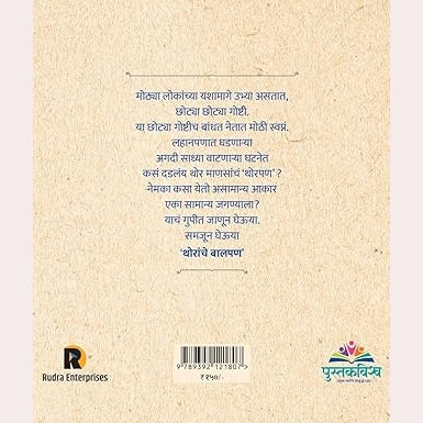 मोठ्या लोकांच्या यशामागे उभ्या असतात, छोट्या छोट्या गोष्टी. या छोट्या गोष्टीच बांधत नेतात मोठी स्वप्नं. लहानपणात घडणाऱ्या अगदी साध्या वाटणाऱ्या घटनेत कसं दडलंय थोर माणसांचे 'थोरपण' ? नेमका कसा येतो असामान्य आकार एका सामान्य जगण्याला? याचं गुपीत जाणून घेऊया. समजून घेऊया 'थोरांचे बालपण'