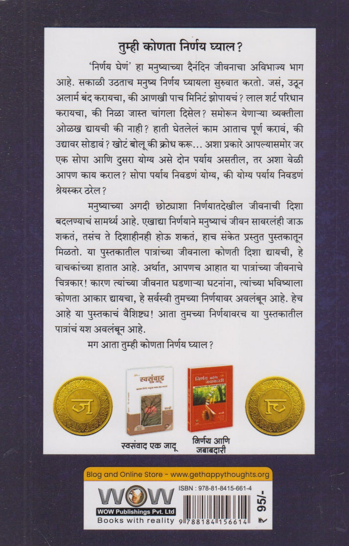 तुम्ही कोणता निर्णय घ्याल? 'निर्णय घेणं' हा मनुष्याच्या दैनंदिन जीवनाचा अविभाज्य भाग आहे. सकाळी उठताच मनुष्य निर्णय घ्यायला सुरुवात करतो. जसं, उठून अलार्म बंद करायचा, की आणखी पाच मिनिटं झोपायचं? लाल शर्ट परिधान करायचा, की निळा जास्त चांगला दिसेल? समोरून येणाऱ्या व्यक्तीला ओळख द्यायची की नाही? हाती घेतलेलं काम आताच पूर्ण करावं, की उद्यावर सोडावं ? खोटं बोलू की क्रोध करू... अशा प्रकारे आपल्यासमोर जर एक सोपा आणि दुसरा योग्य असे दोन पर्याय असतील, तर अशा वेळी आपण काय कराल? सोपा पर्याय निवडणं योग्य, की योग्य पर्याय निवडणं श्रेयस्कर ठरेल ? मनुष्याच्या अगदी छोट्याशा निर्णयातदेखील जीवनाची दिशा बदलण्याचं सामर्थ्य आहे. एखाद्या निर्णयाने मनुष्याचं जीवन सावरलंही जाऊ शकतं, तसंच ते दिशाहीनही होऊ शकतं, हाच संकेत प्रस्तुत पुस्तकातून मिळतो. या पुस्तकातील पात्रांच्या जीवनाला कोणती दिशा द्यायची, हे वाचकांच्या हातात आहे. अर्थात, आपणच आहात या पात्रांच्या जीवनाचे चित्रकार ! कारण त्यांच्या जीवनात घडणाऱ्या घटनांना, त्यांच्या भविष्याला कोणता आकार द्यायचा, हे सर्वस्वी तुमच्या निर्णयावर अवलंबून आहे. हेच आहे या पुस्तकाचं वैशिष्ट्य ! आता तुमच्या निर्णयावरच या पुस्तकातील पात्रांचं यश अवलंबून आहे. मग आता तुम्ही कोणता निर्णय घ्याल?